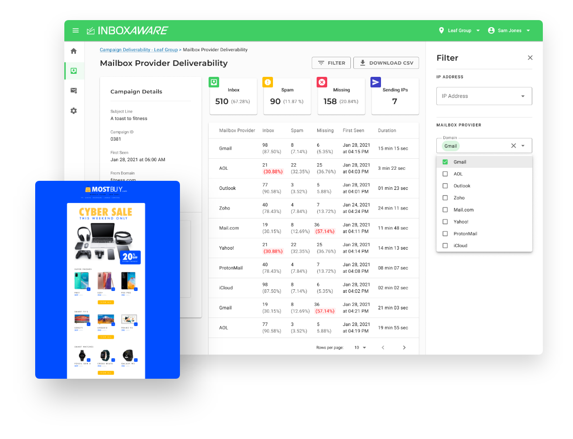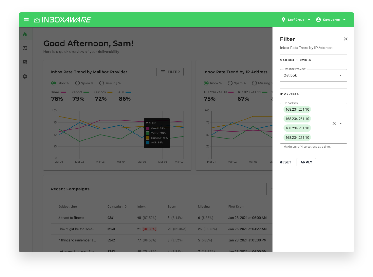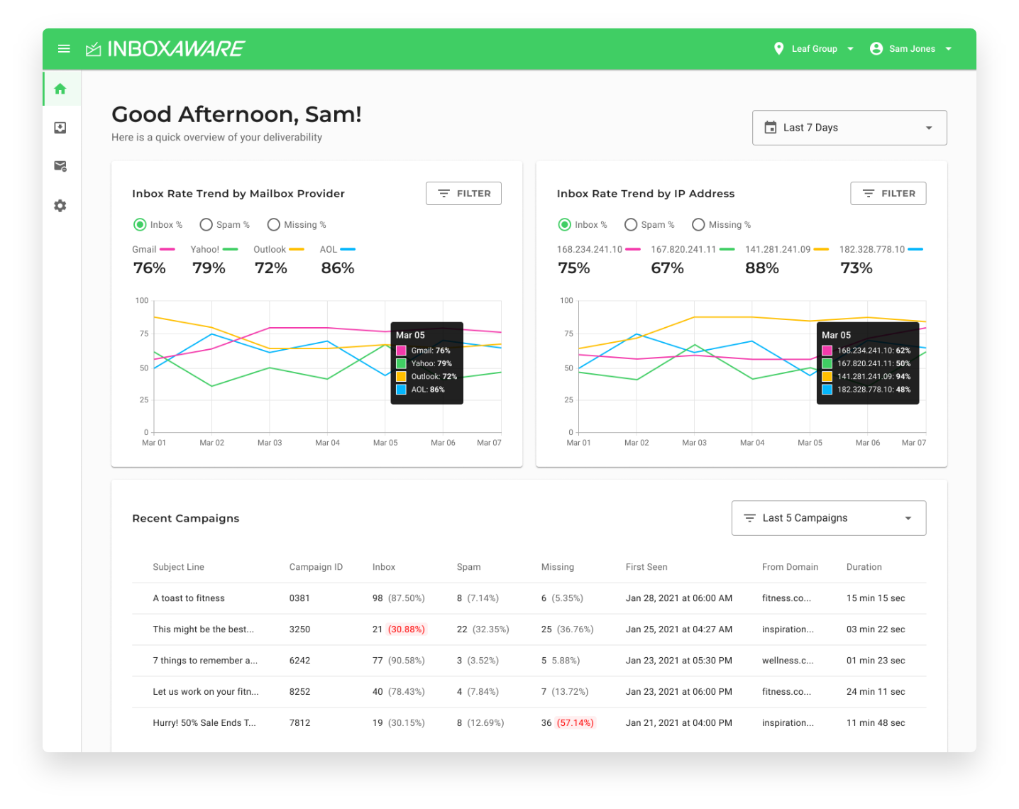 InboxAware offers both a holistic overview of your emails’ performance and advanced analytics that allow you to deep-dive into each factor that impacts your email performance and inbox placement.